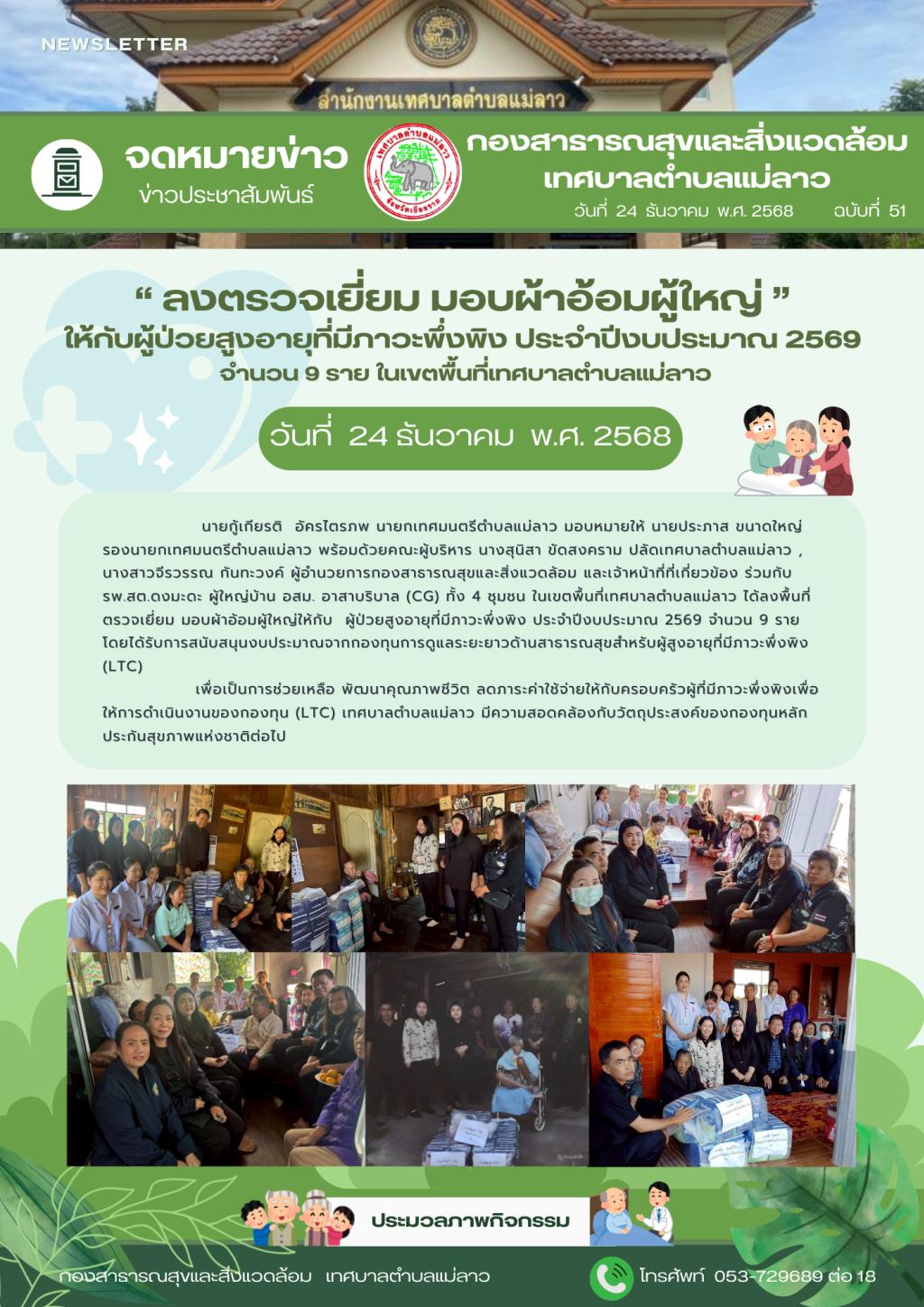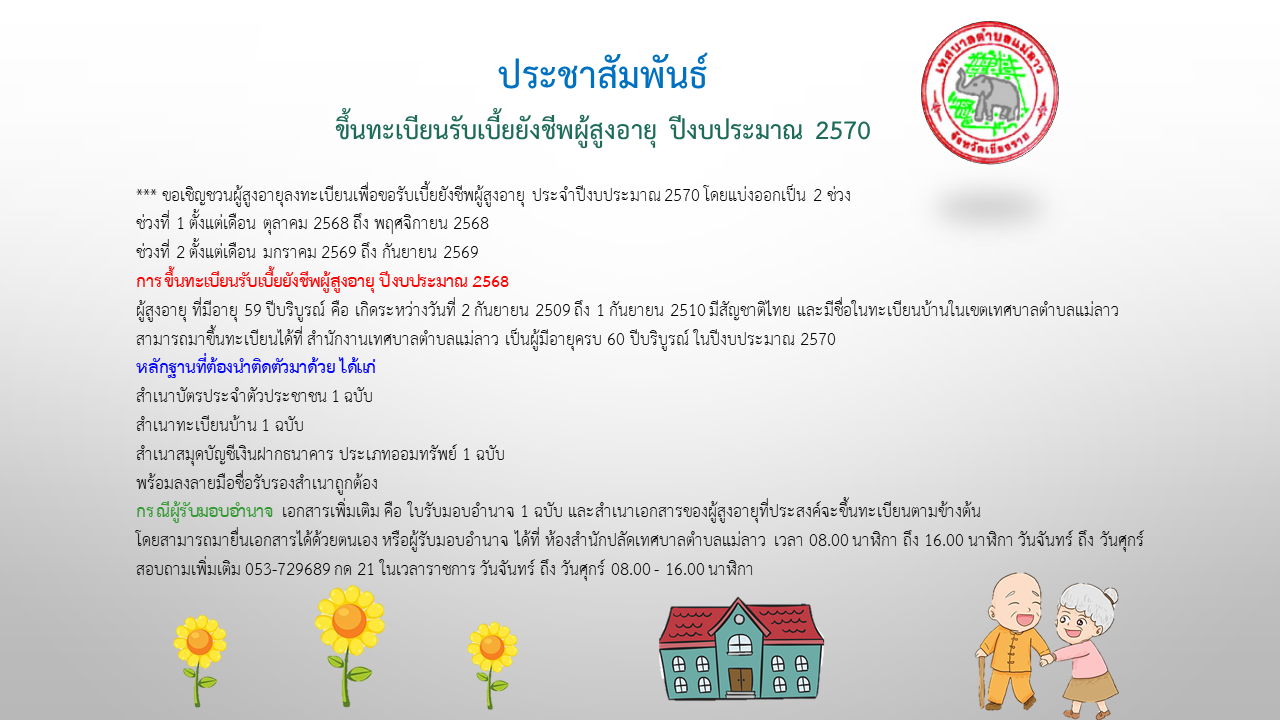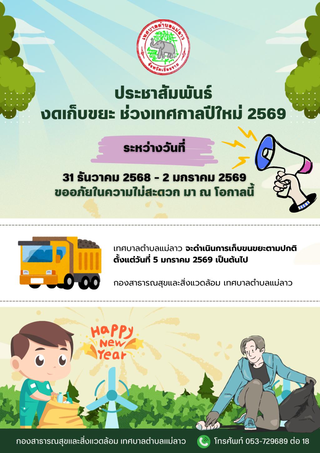 | 10 | (ประกาศรายชื่อผู้ชนะการเสนอราคา / ประกาศผู้ได้รับการคัดเลือก) ซื้ออาหารเสริม(นม) โรงเรียนพลาสเจอร์ไรส์ ขนาด ๒๐๐ ซีซี ตรานมโรงเรียน ชนิดถุง ประจำเดือน มกราคม ๒๕๖๙ ศูนย์พัฒนาเด็กเล็กเทศบาลตำบลแม่ลาว จำนวน ๒๐๐ ถุง โดยวิธีเฉพาะเจาะจง | คลิกอ่าน.. | 30/12/2568 |