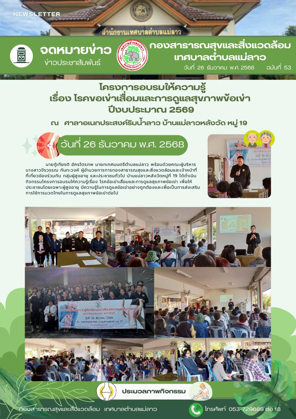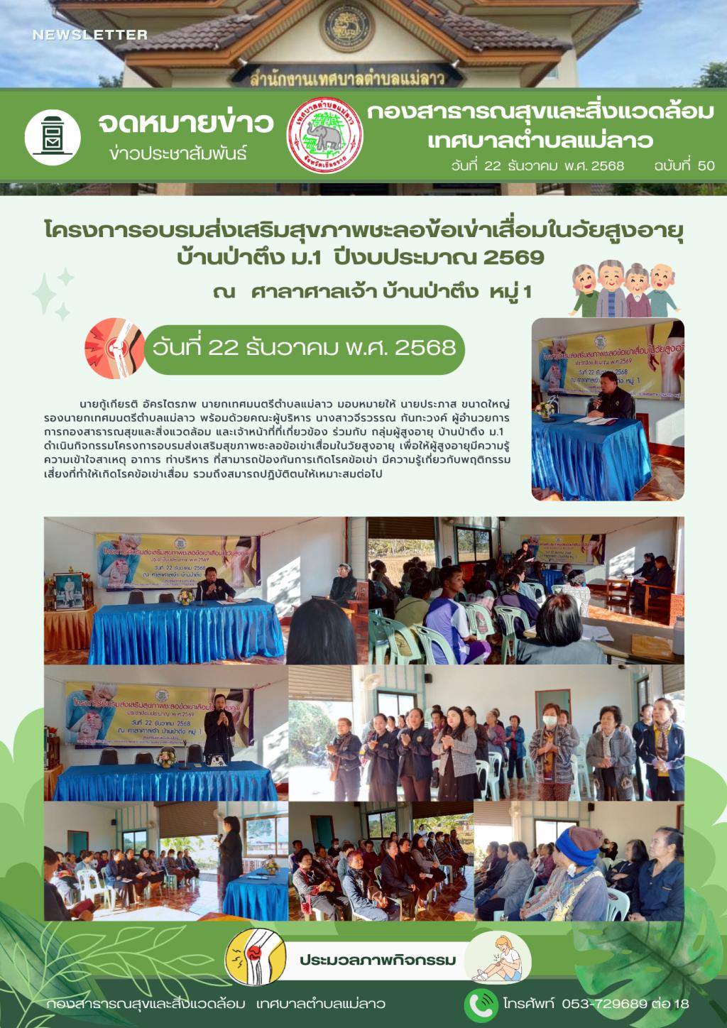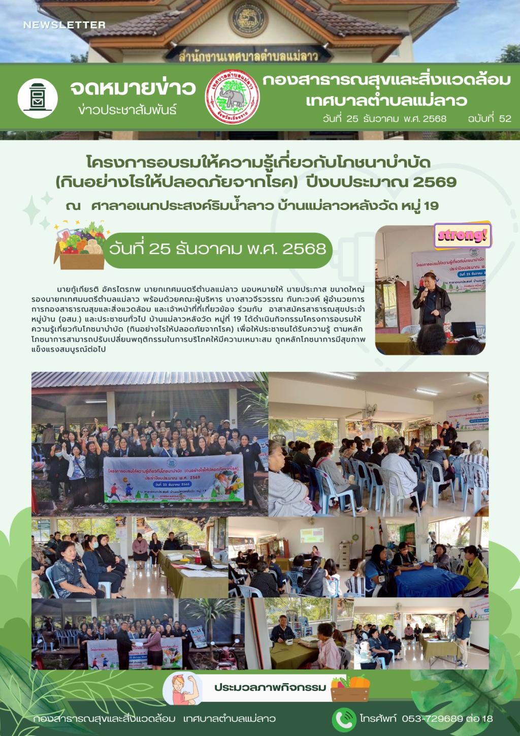 | 5 | (ประกาศรายชื่อผู้ชนะการเสนอราคา / ประกาศผู้ได้รับการคัดเลือก) จ้างจัดทำอาหารากลางวัน และอาหารว่างพร้อมเครื่องดื่มโครงการอบรมการทำขนมไทย บ้านแม่ลาวหลังวัด หมู่ ๑๙ ประจำปีงบประมาณ ๒๕๖๙ โดยวิธีเฉพาะเจาะจง | คลิกอ่าน.. | 8/1/2569 |