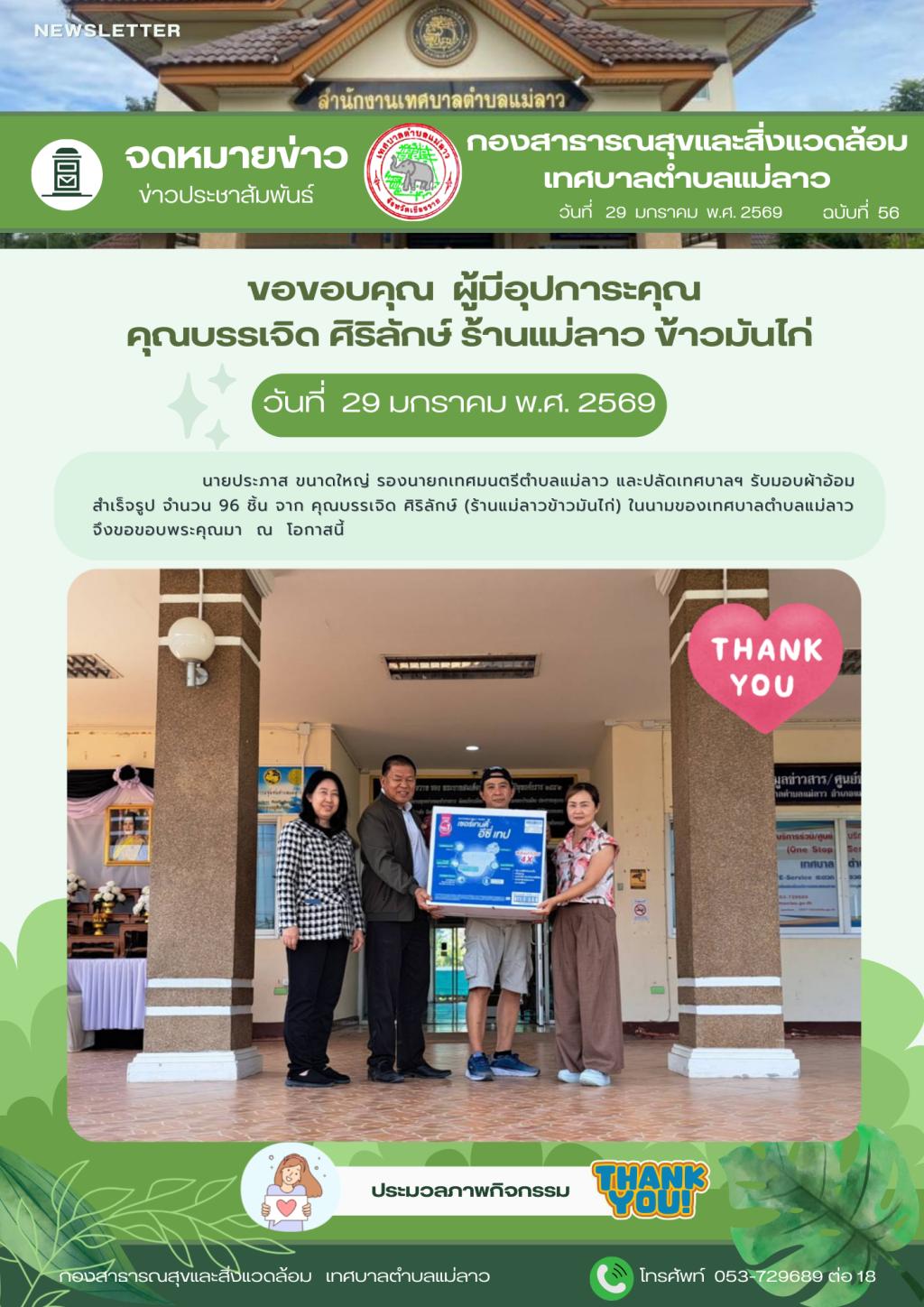 | 7 | (ประกาศรายชื่อผู้ชนะการเสนอราคา / ประกาศผู้ได้รับการคัดเลือก) ซื้ออาหารเสริม(นม) โรงเรียนพลาสเจอร์ไรส์ ขนาด ๒๐๐ ซีซี ตรานมโรงเรียน ชนิดถุง ประจำเดือน กุมภาพันธ์ ๒๕๖๙ ศูนย์พัฒนาเด็กเล็กเทศบาลตำบลแม่ลาว จำนวน ๒๒๐ ถุง โดยวิธีเฉพาะเจาะจง | คลิกอ่าน.. | 30/1/2569 |