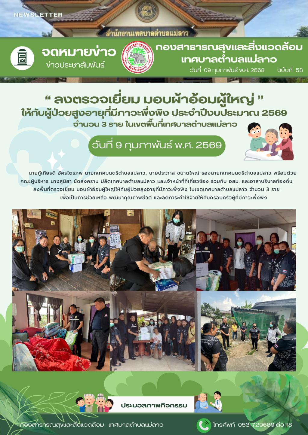“ ลงตรวจเยี่ยม มอบผ้าอ้อมผู้ใหญ่ ” ให้กับผู้ป่วยสูงอายุที่มีภาวะพึ่งพิง ประจำปีงบประมาณ 2569 จำนวน 9 ราย ในเขตพื้นที่เทศบาลตำบลแม่ลาว...