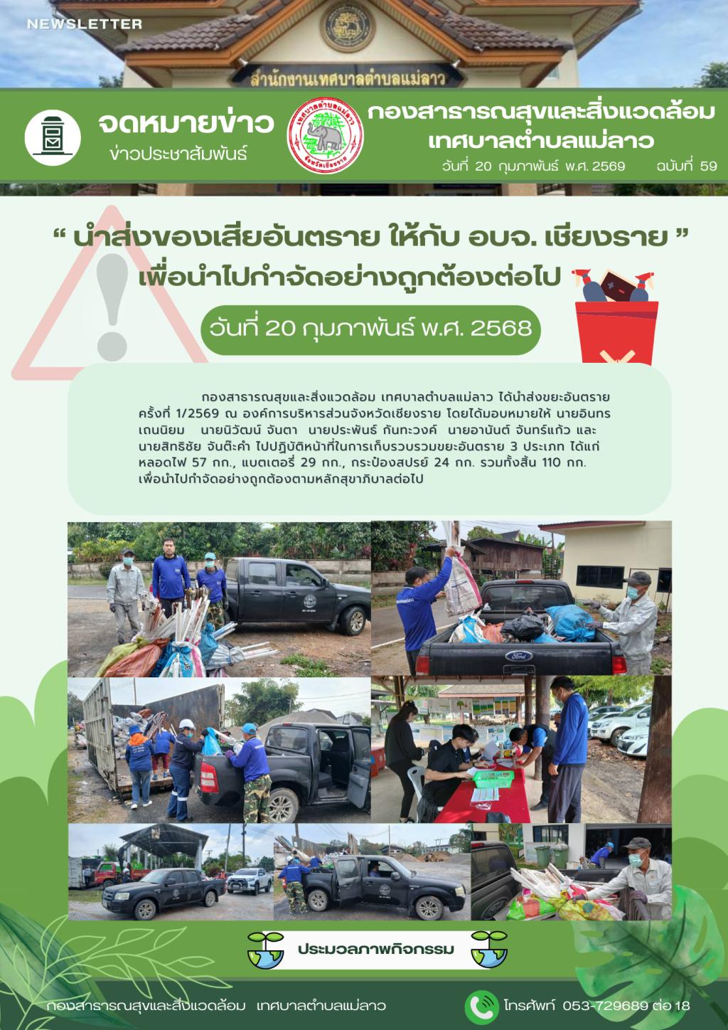 | 2 | (ประกาศรายชื่อผู้ชนะการเสนอราคา / ประกาศผู้ได้รับการคัดเลือก) จ้างเหมาจัดทำอาหารกลางวัน อาหารว่างพร้อมเครื่องดื่ม โครงการเทศบาลแม่ลาว พบประชาชน (หมู่ที่ 19) โดยวิธีเฉพาะเจาะจง | คลิกอ่าน.. | 20/2/2569 |