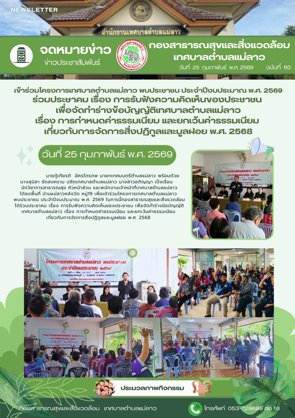 | 5 | (ประกาศรายชื่อผู้ชนะการเสนอราคา / ประกาศผู้ได้รับการคัดเลือก) จ้างเหมาบริการช่วยเหลืองานกองสาธารณสุข ประจำเดือน มีนาคม - พฤษภาคม ๒๕๖๙ โดยวิธีเฉพาะเจาะจง | คลิกอ่าน.. | 27/2/2569 |