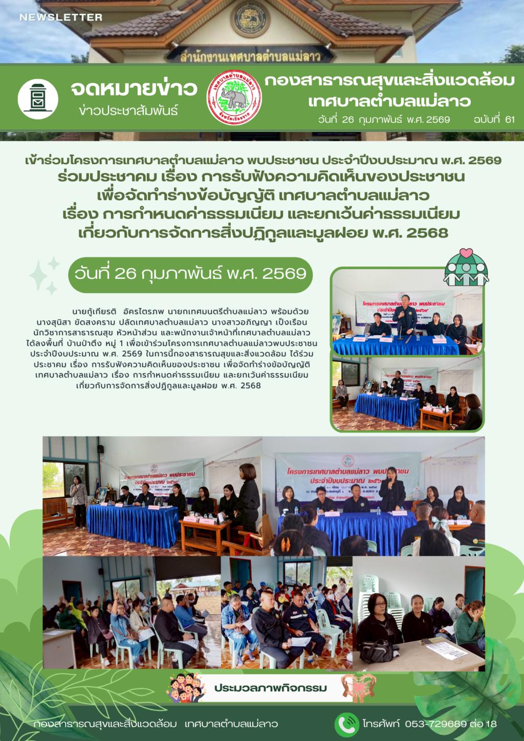 | 4 | (ประกาศรายชื่อผู้ชนะการเสนอราคา / ประกาศผู้ได้รับการคัดเลือก) จ้างโครงการปรับปรุงถนน คสล.ซอย 13 และซอย 14 เป็นผิวทางแอสฟัลท์ติกคอนกรีต บ้านแม่ลาวหลังโรงเรียน หมู่ 4 ตำบลดงมะดะ อำเภอแม่ลาว จังหวัดเชียงราย โดยวิธีเฉพาะเจาะจง | คลิกอ่าน.. | 27/2/2569 |