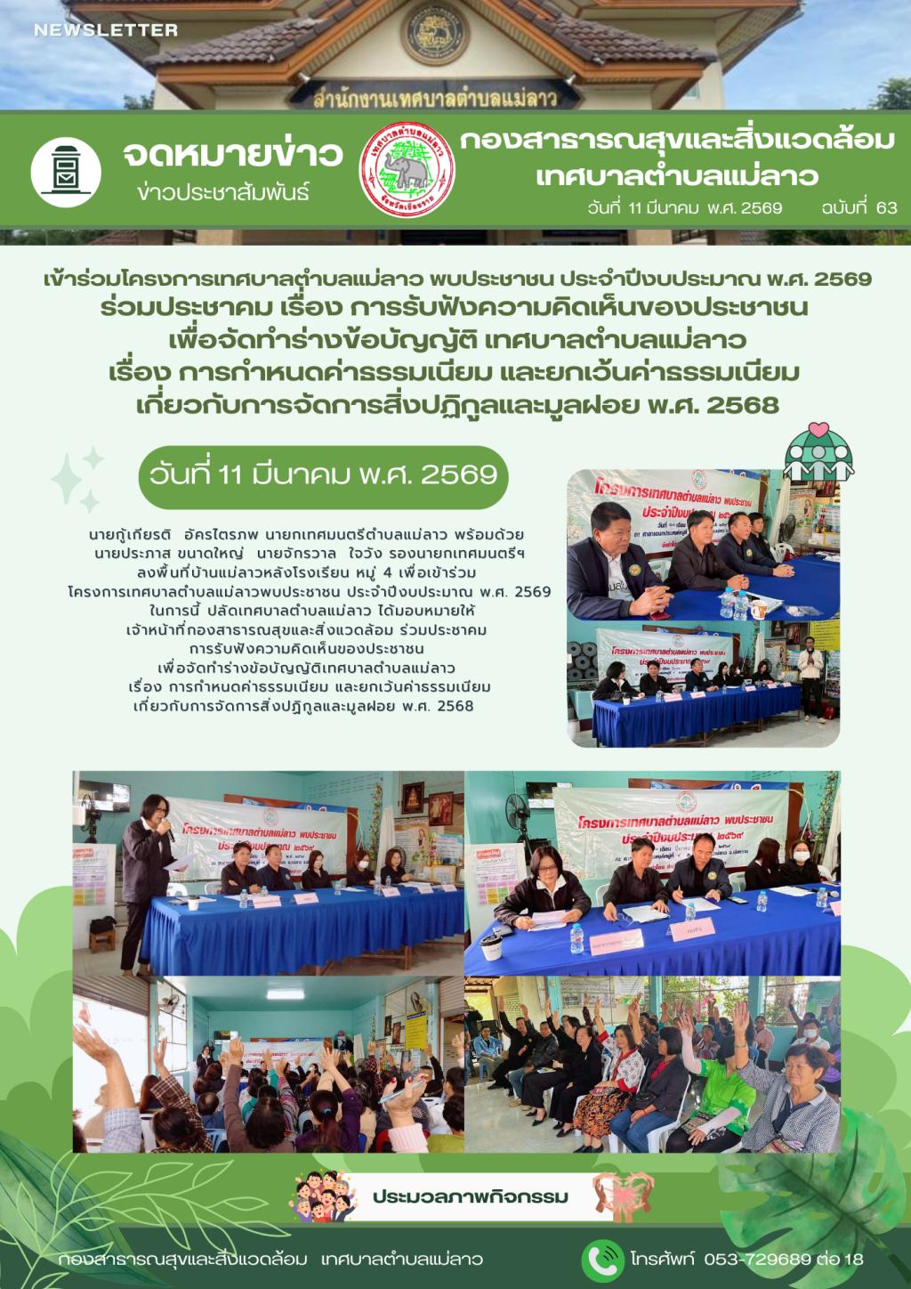 | 3 | (ประกาศรายชื่อผู้ชนะการเสนอราคา / ประกาศผู้ได้รับการคัดเลือก) จ้างจัดทำป้ายโครงการอาสาสมัครท้องถิ่นรักษ์โลก (อถล.) ประจำปีงบประมาณ ๒๕๖๙ โดยวิธีเฉพาะเจาะจง | คลิกอ่าน.. | 11/3/2569 |