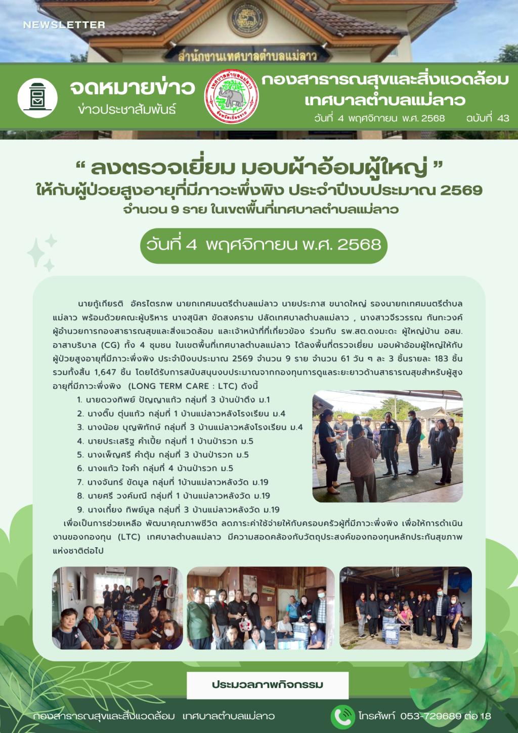 ลงตรวจเยี่ยม มอบผ้าอ้อมผู้ใหญ่ ให้กับผู้ป่วยสูงอายุที่มีภาวะพึ่งพิง ประจำปีงบประมาณ 2569 จำนวน 9 ราย ในเขตพื้นที่เทศบาลตำบลแม่ลาว...