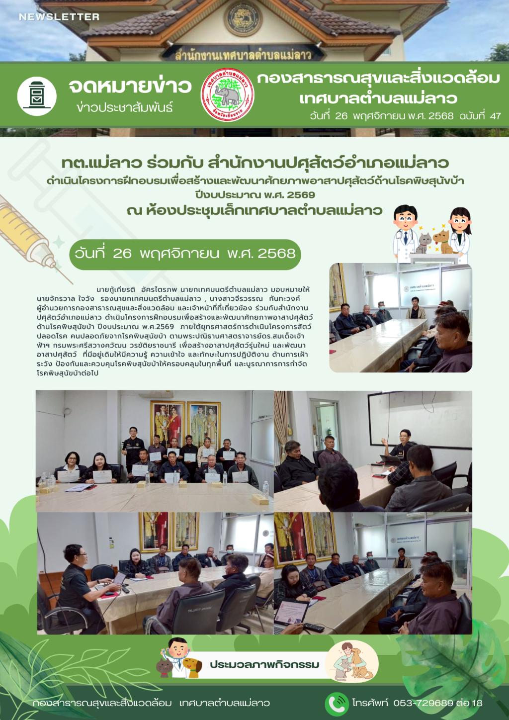 ทต.แม่ลาว ร่วมกับ สำนักงานปศุสัตว์อำเภอแม่ลาว ดำเนินโครงการฝึกอบรมเพื่อสร้างและพัฒนาศักยภาพอาสาปศุสัตว์ด้านโรคพิษสุนัขบ้า ปีงบประมาณ พ.ศ. 2569 ...