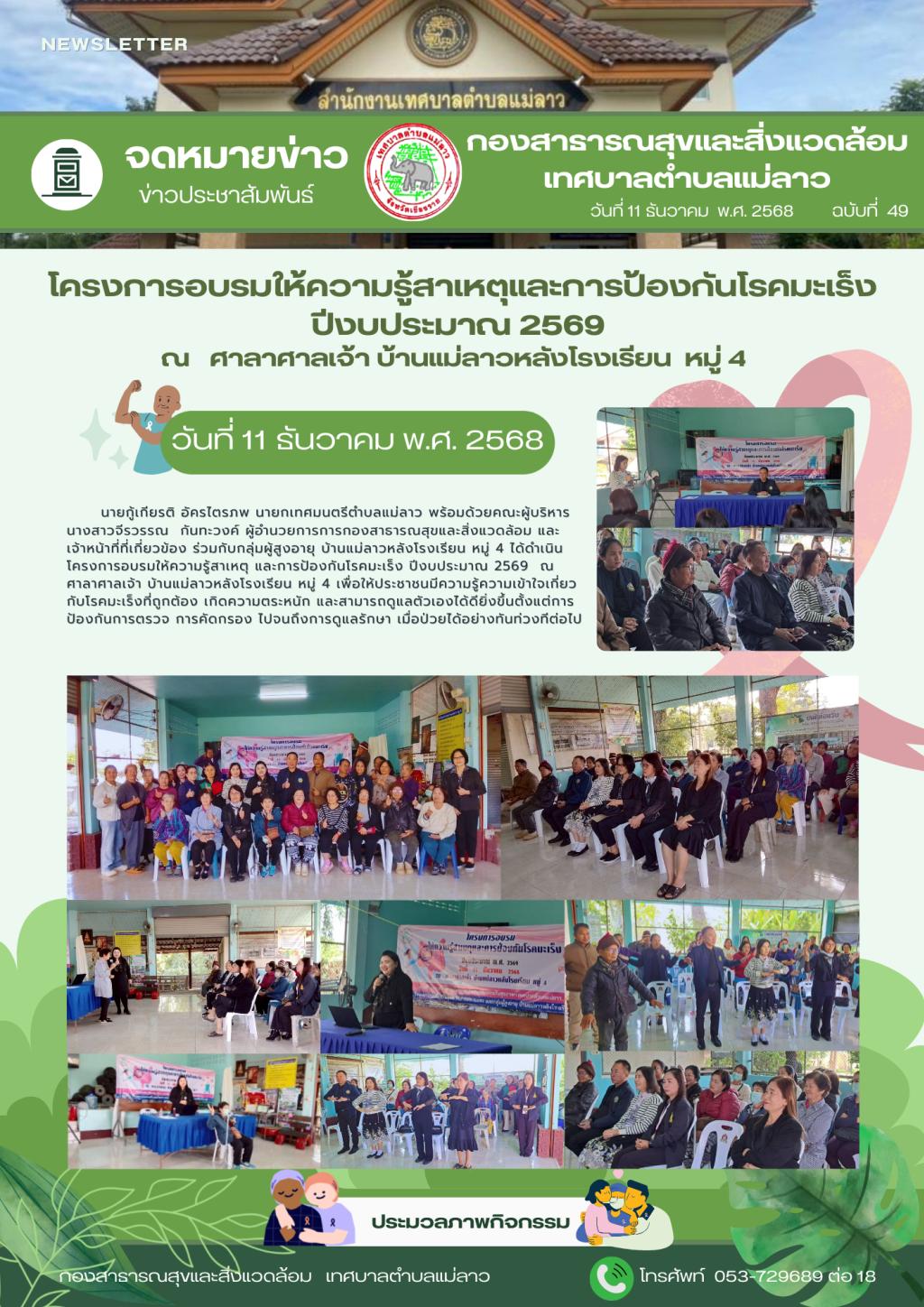 โครงการอบรมให้ความรู้สาเหตุและการป้องกันโรคมะเร็ง ปีงบประมาณ 2569 ณ ศาลาศาลเจ้า บ้านแม่ลาวหลังโรงเรียน หมู่ 4...